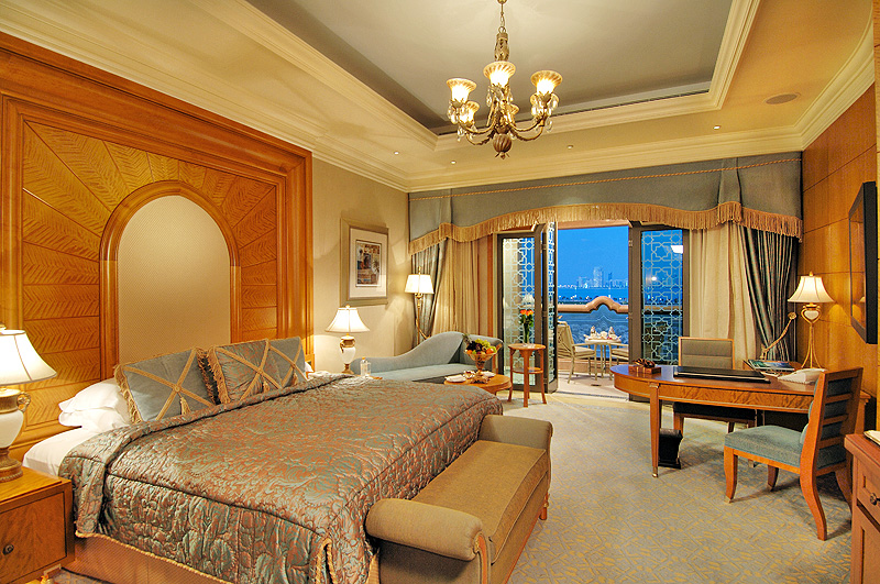 Palace Suite (680 кв. м) - с видом на залив, расположены на 6-ом и 7-ом этажах, состоят из 3 спален, гостиной, столовой, холла, гардеробной, ванных комнат с джакузи и душем. Также включен дополнительный сервис: напитки и закуски в течение дня, трансфер в аэропорт и обратно на лимузине, круглосуточные услуги дворецкого.