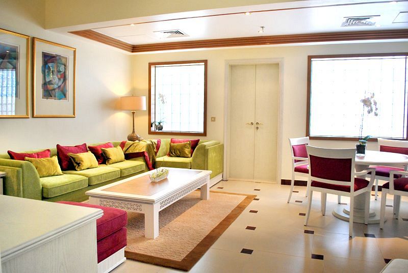 В комфортабельных номерах - элегантные интерьеры в теплых тонах, гармонично соединяющие современный стиль и арабские мотивы, с изысканными украшениями.
